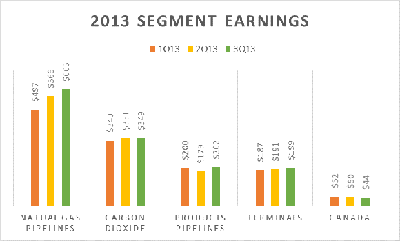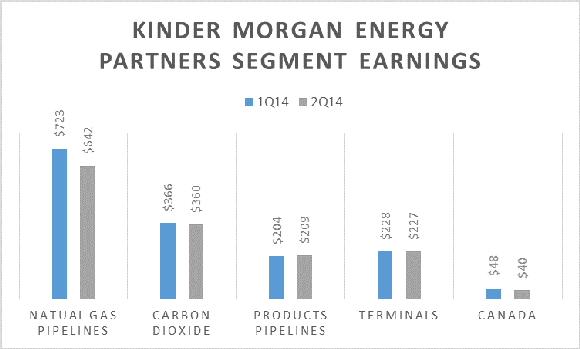 Kinder Morgan Energy Partners currently fuels about 75% of Kinder Morgan's income, so its results are critical to the company. The biggest driver of its business is its natural gas pipeline segment. As we see in the following chart, that segment's earnings are almost double its next largest segment.