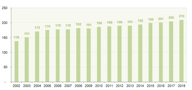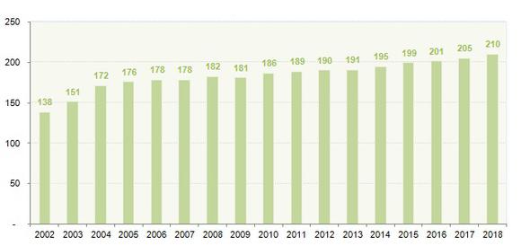 U.S. fast-food restaurant industry revenue history and forecast from 2002 to 2018, chart by author, Source: Statista. Y axis = revenue in billions of dollars.