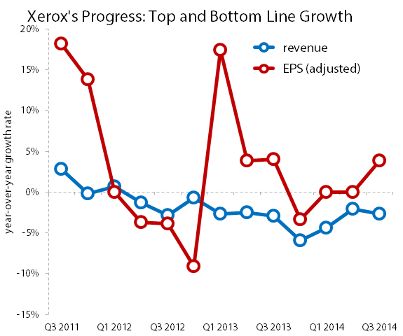 Let's take a closer look at Xerox's progress now, starting with top- and bottom-line growth, which you'll notice have continued a recent trend: