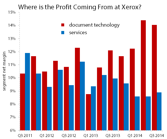 Services has seen its top-line growth stall out in recent quarters, which is bad news considering Xerox has been actively reducing its dependence on its Document Technology segment for some time. This might not be such an issue if Services were actually producing plus-sized profits; but margins in this segment have dwindled as Document Technology has become a better moneymaker than ever: