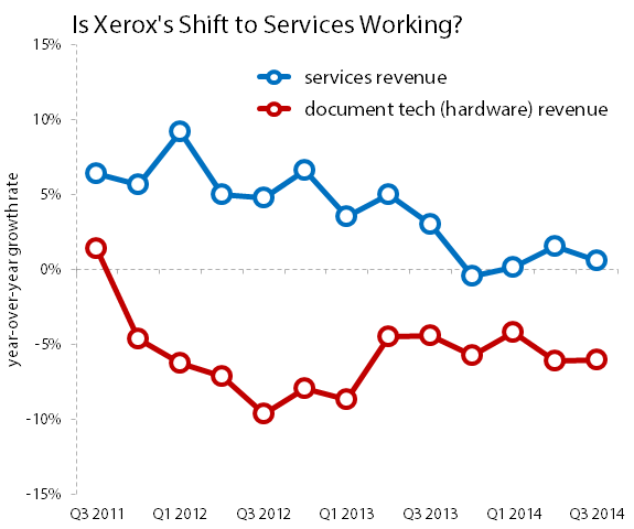 To understand why this is happening, we must look more closely at Xerox's two core segments: Services and Document Technology. Document Technology is Xerox's legacy hardware business, focused on copiers and printers, while services is broadly focused on helping companies and government agencies manage their data. Services is the segment on which Xerox has pinned its future; but its recent progress has not been particularly encouraging: