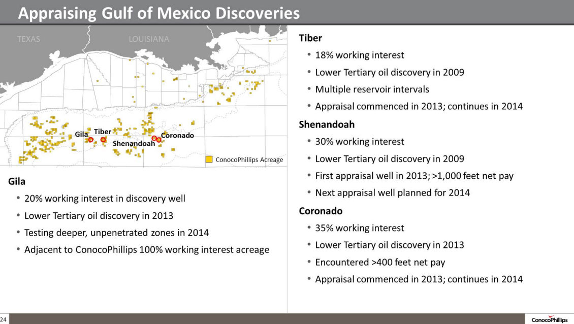 Finding noncommercial oil is always a risk, and that's exactly what happened to the company's Coronado prospect in the Gulf of Mexico during the quarter. The prospect, which was discovered with Chevron (CVX +0.64%) and Anadarko (APC +0.00%) last year, proved not to be worth pursuing after further tests. The company expensed the initial wildcat well as nothing more than a dry hole. Still, ConocoPhillips has three other compelling prospects under appraisal and well over 2 million acres spread across the Gulf as it continues to explore for oil.