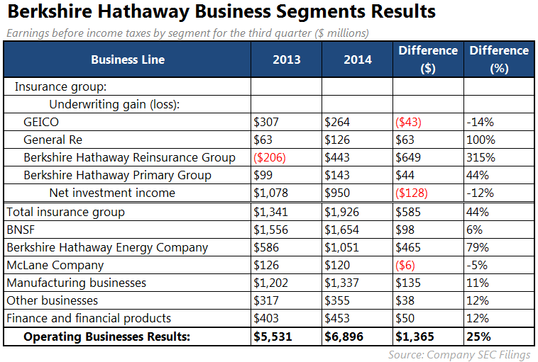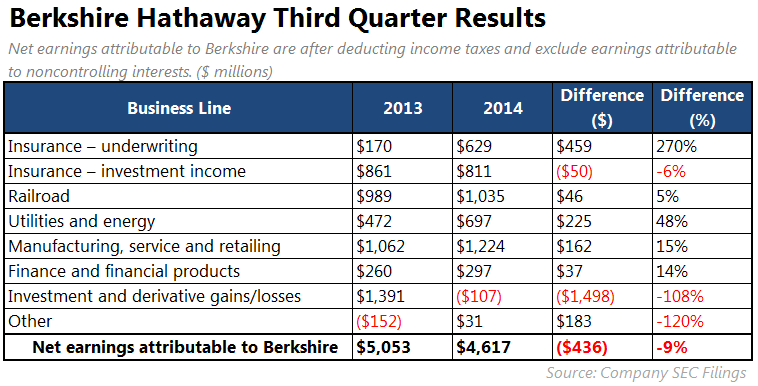 A glance at the results from the businesses of Berkshire reveal where the sizable dip came from: