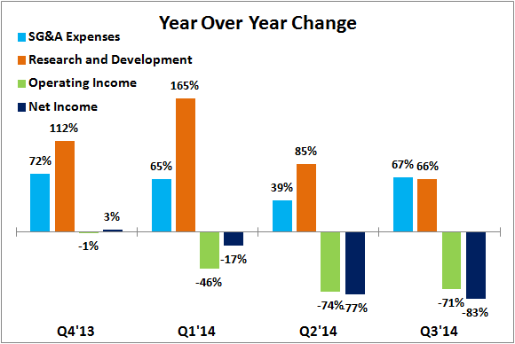 To capitalize on its market opportunity, 3D Systems' operating expenses continued to trend higher in the third quarter, and came at the expense of operating profits and net income. In other words, 3D Systems remains more focused on the long-term operating performance of the business than with short-term results.