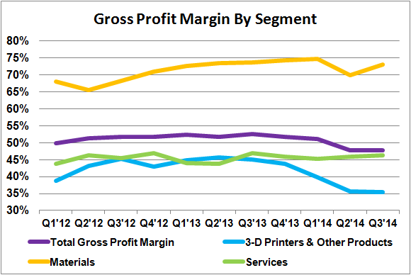 3D Systems' third-quarter gross profit margin held steady from the second quarter, but fell about 480 basis points year over year. By segment, a rebound in 3D Systems' lush materials gross profit margin counterbalanced the slide that its 3D printers and products experienced -- the latter of which represented about 44% of total sales.