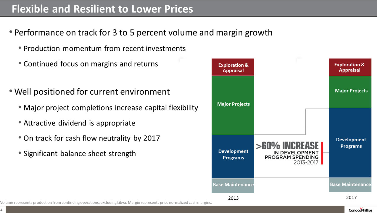 This year ConocoPhillips expects to spend $16.7 billion on capital projects. Of that amount 35%, or nearly $6 billion was spent on major capital projects around the world. However, 2014 represented the peak spending for several major projects including APLNG in Australia and the second phase of its Surmont oil sands project in Canada. With that peak now past, ConocoPhillips has more flexibility than ever to cut capital spending as well as focus capital on projects that will yield an immediate boost to cash flow.