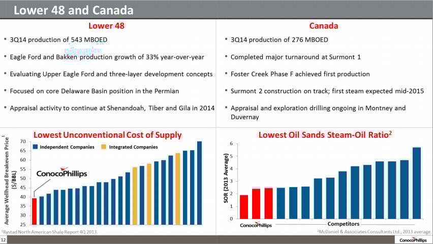 These low cost supplies also represent ConocoPhillips' two fastest growing production areas. As we see on the following slide, the company plans to grow production from unconventional sources by 22% per year through 2017 while also growing production from the oil sands by 21% per year over that same time frame.