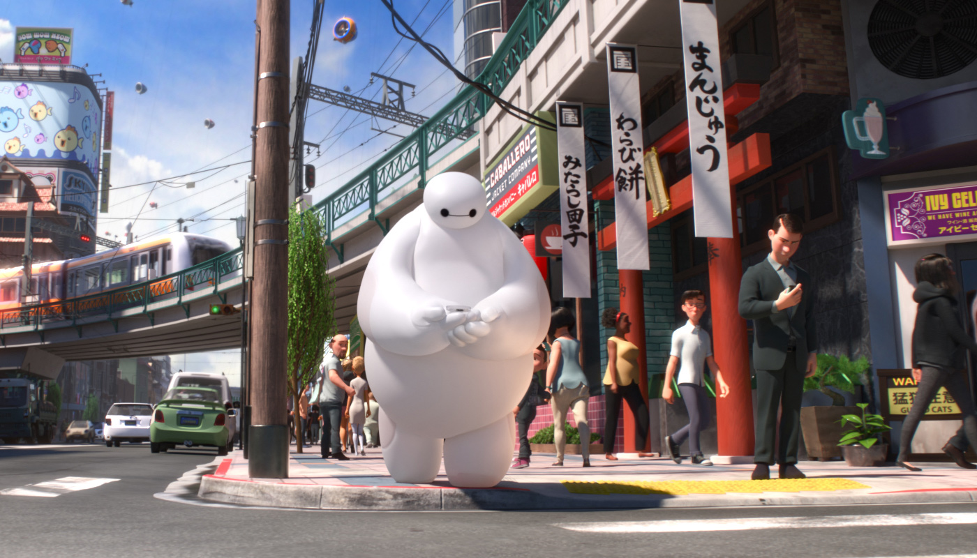 Baymax walks the streets of San Fransokyo in Disney's Big Hero 6. Credit: Disney Animation.