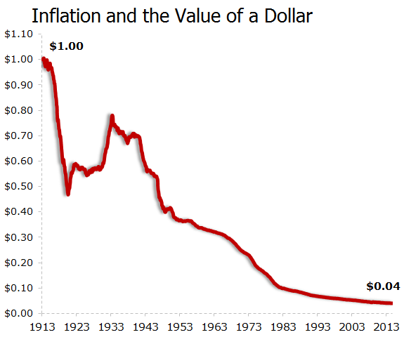 Over time, the purchasing power of a single American dollar has plunged, as you can see in this chart of the purchasing power of a consumer dollar from 1913 to the present day:
