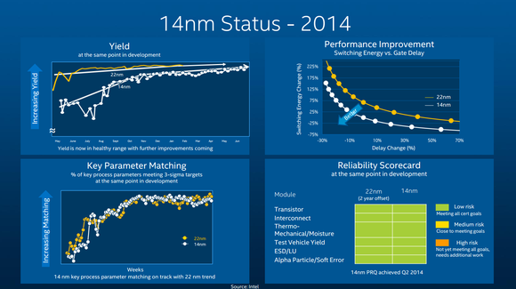 While the technology apparently meets the company's reliability goals, the yields -- or the percentage of good chips that come from a given wafer -- still aren't as robust as the yields Intel achieved with its 22-nanometer process at the same point in its development. Given that Intel plans to ramp a number of 14-nanometer products during 2015, this has a meaningful impact on the company's product cost structure.