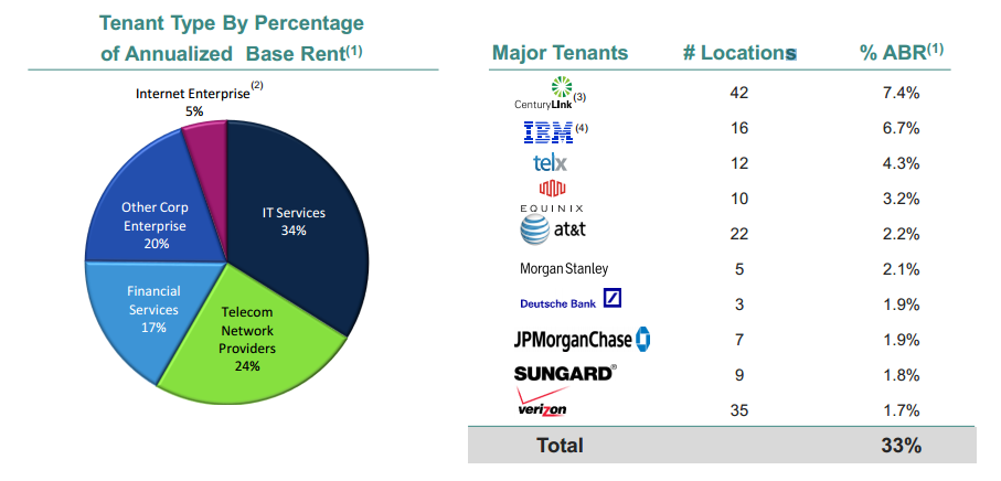 While the top two tenants, CenturyLink and IBM, accounting for more than 14% of total revenue is a tad concentrated, it isn't high enough to warrant great concern.