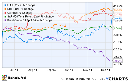 Of course, those lower oil prices still need time to work through the supply chain to translate to lululemon's bottom line. But in the meantime, the aforementioned tailwind in the athletic apparel industry is clear, as players like lululemon, Under Armour, and Nike ride the momentum from each of their respective impressive quarterly reports: