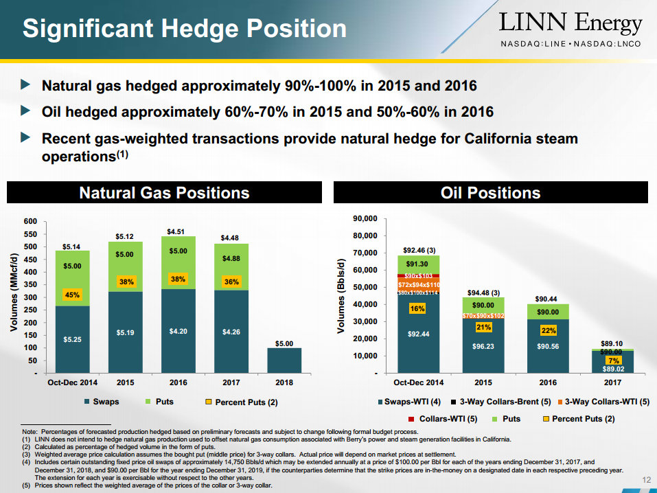 That slide also shows that 60%-70% of Linn's oil volumes are hedged heading into 2015, with 50%-60% hedged the following year. These hedges protect a large portion of the company's cash flow for the next two years, which is bolstered by the 90%-100% of LINN Energy natural gas production that is hedged. The company estimates that roughly 90% of its cash flow is secure for the next two years, no matter what happens with the price of oil.
