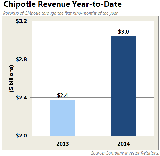 Throw in the reality that its average restaurant sales are up 12.3% through the first nine months of the year to nearly $2.5 million, and all signs indicate the torrid growth of Chipotle has no sign of slowing down anytime soon.