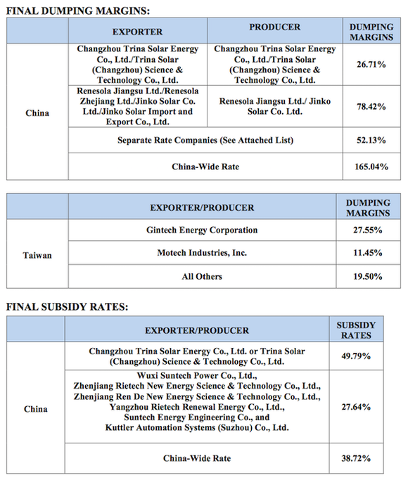 On top of that, Chinese manufacturers will receive anti-subsidy tariffs of 27.64%-49.79%. The full rate structure for different companies can be seen below. Notable are tariffs on Trina Solar (NYSE: TSL), Yingli Green Energy (NYSE: YGE), and Canadian Solar (CSIQ +15.72%) total 76.5%, 90.9%, and 90.9% respectively.