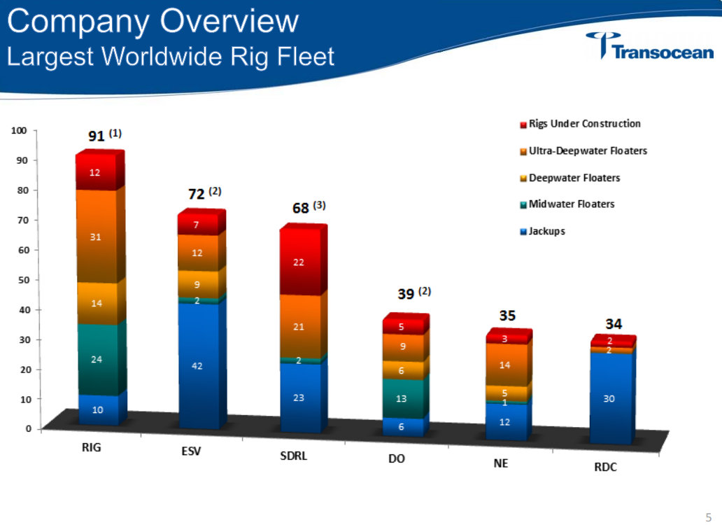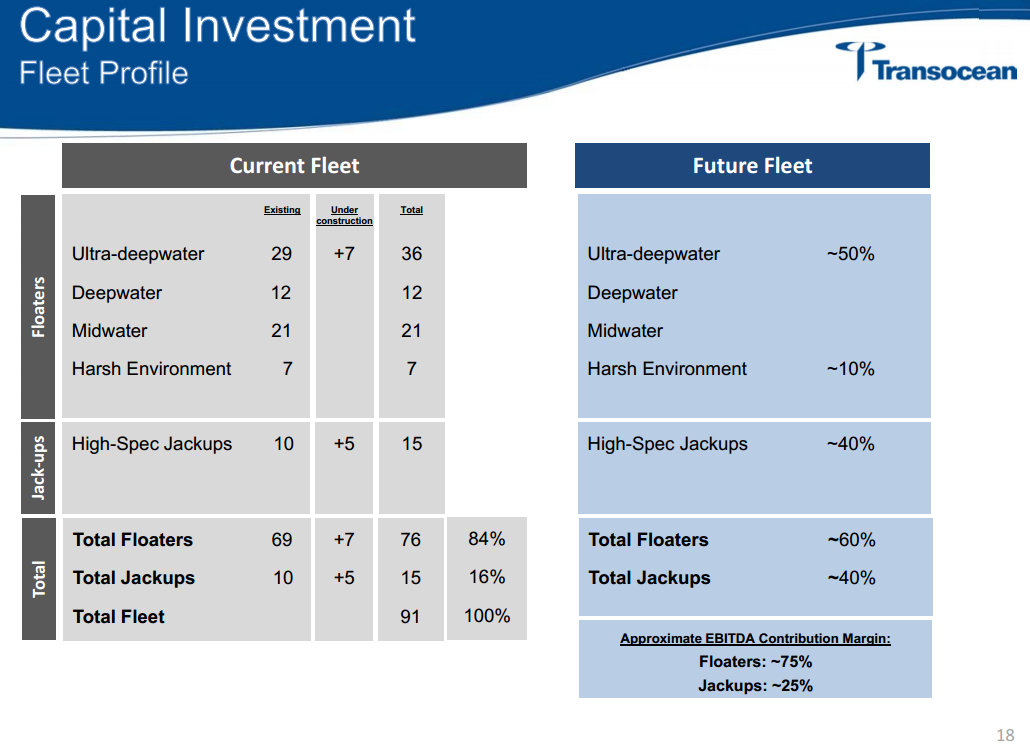 Even with 11 vessels retiring, Transocean still will hold a lead over its nearest competitors. However, the company has said in the past that the current makeup of its fleet won't be the same in the future. The company sees both midwater and deepwater floaters eventually exiting its fleet as it shifts toward a fleet focused mainly on ultra-deepwater and high-spec jackups.