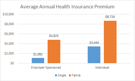 At first glance, health coverage not obtained through employers appears much more costly. According to eHealth (EHTH +4.04%), individuals currently pay $3,444 annually for single coverage and $8,724 for family coverage -- or $287 and $727 per month, respectively. The online health insurance provider tracks premiums for all Affordable Care Act plans submitted through its site.