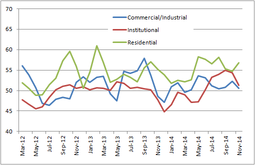In other words, Allegion is a play on a recovery on the North American construction markets. The good news is that the most widely followed indicator of future growth in North American construction, the Architecture Billings Index, indicates that conditions are set to improve. In the chart below, a reading above 50 indicates growth. Despite the drop in November, the institutional reading has been positive for the last six months. According to the American Institute of Architects, the index "leads nonresidential construction activity by approximately 11 months."