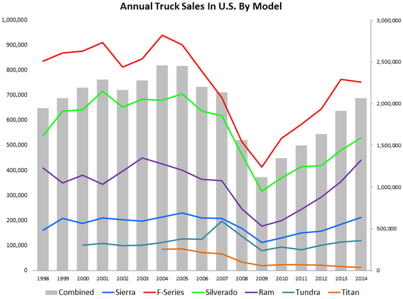 In 2014 Nissan sold a whopping 12,527 trucks in the U.S. -- which Ford's F-Series managed to do in only five selling days last month. Furthermore (as you can see in the graph below), despite sales of full-size trucks surging in recent years, without a fresh product to compete with its peers', the Titan has seen its sales decline.