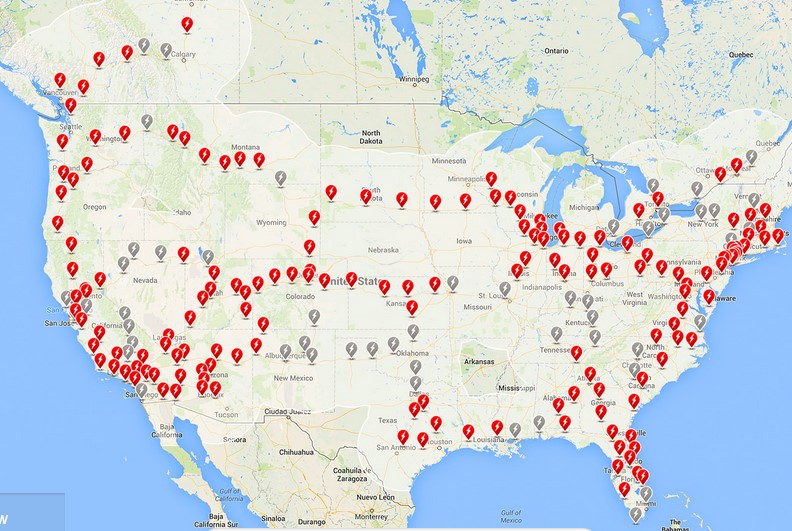 Source: Tesla Motors, red = open now, grey = opening soon.