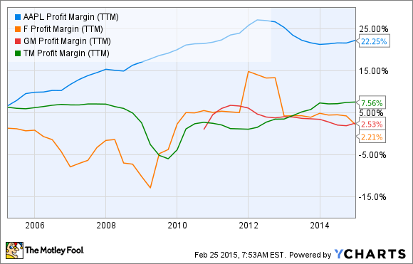 Toyota's the world's largest automaker (by sales) and it's profit margin is less than 8% -- compared with Apple's 22%.