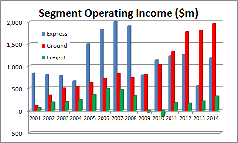 Third, in addition to the growth investment, FedEx has had to invest substantially because its income base has shifted since the recession. Simply put, customers have been preferring slower and cheaper delivery options. You can see how this shift has played out in FedEx's operating-income statements.