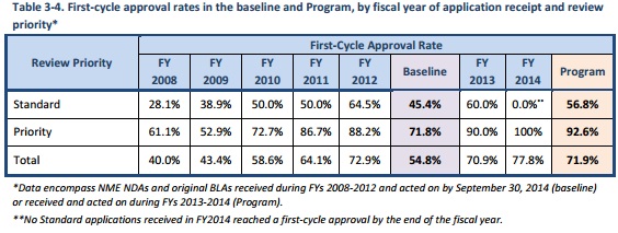 But if you look at the four individual years under PDUFA IV, you'll see that the FDA had already begun loosening its standards for approval. Only 40% of applications were approved on their first application in fiscal year 2008 compared to 72.9% in fiscal year 2012, slightly higher than the average of the first two years of PDUFA V.