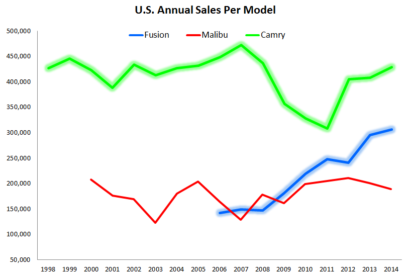 Here's a look at how the Fusion quickly gained ground on Toyota's Camry, the segment's longtime leader in sales, and how the Malibu has been treading water.