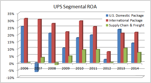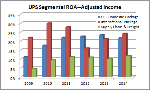To see the impact of the three big trends, I've broken out segmental ROA for UPS. For reference, the U.S. domestic package segment contributed 63% of adjusted segmental income in 2014, with international package 27% and supply chain and freight around 10%. Note that these figures are not adjusted for non-recurring items.