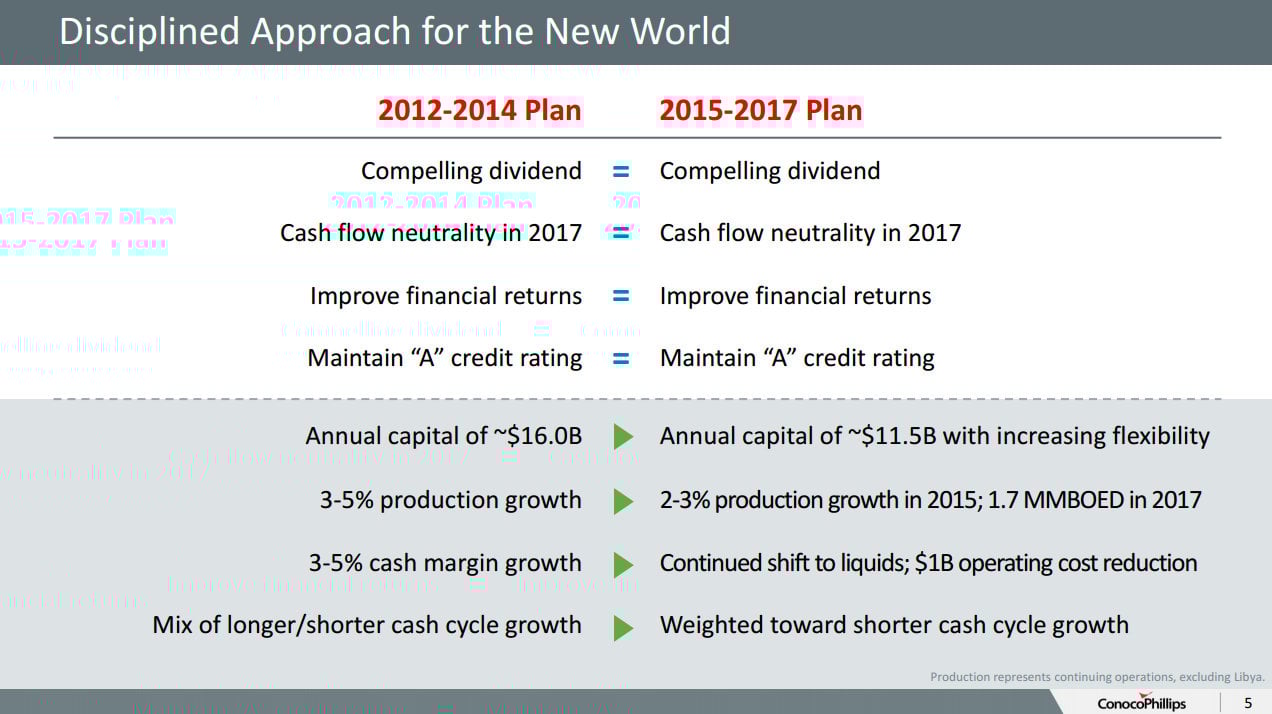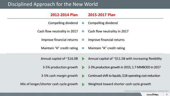 Much of ConocoPhillips' initial plan is staying the same. The company is still planning to pay a compelling dividend, which management has affirmed remains a top priority. Furthermore, the company still plans to be cash flow neutral by 2017 while improving its financial returns and maintaining an A-rated balance sheet. The shift comes in the operational side of the plan, as the reduced price of oil is forcing the company to cut spending and growth so it can still deliver on the core of its plan. This shift is detailed on the slide below.
