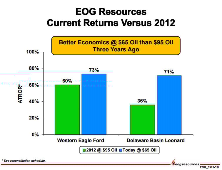 As that slide points out, EOG Resources is seeing returns in the Western Eagle Ford shale of 73% at $65 oil, which is an improvement from the 60% returns it was earning when oil was $95. However, even more compelling are the returns it's seeing in the Permian Basin's Delaware Basin Leonard, as returns zoomed from 36% at $95 oil to 71% at $65 oil.