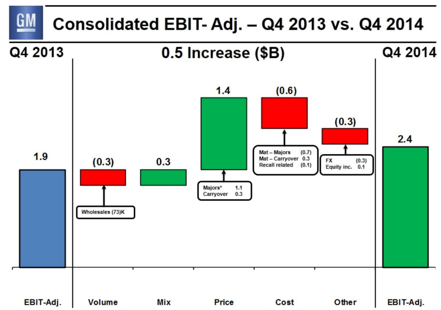 You might be asking yourself how much all of this really matters, so let's take a look at another great example. What does the following EBIT-adjusted bridge say about General Motors' business during the fourth quarter of 2014?