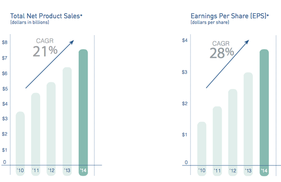 Celgene's best-selling and most well-known medication is Revlimid, a drug that treats a variety of types of blood cancer such as multiple myeloma, mantle cell lymphoma, and myelodysplastic syndromes. Sales of Revlimid approached $5 billion in 2014, up a strong 16% over the prior year, and they show no signs of slowing down anytime soon.