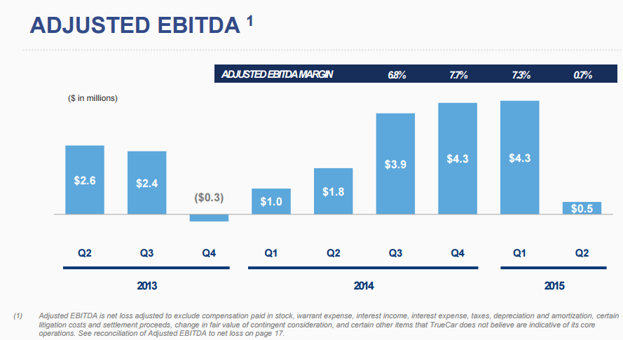 As previously mentioned, if you hadn't been following TrueCar closely, you would have considered it a decent quarter until you hit slide 11, when the adjusted EBITDA was like a smack upside the head. It was a staggering drop year over year and an even worse plunge sequentially from the first quarter. It quickly put an end to the strong adjusted-EBITDA performances in the past three quarters, and TrueCar remained unprofitable in non-GAAP and net loss figures: negative $0.05 per share and negative $0.18 per share, respectively.