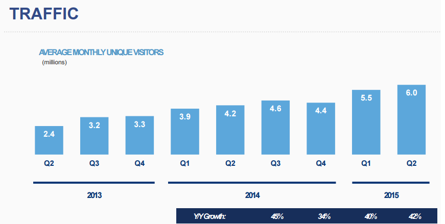TrueCar users purchased more than 190,000 units from the company's certified dealership network, which was a healthy 27% increase over last year's second quarter. TrueCar-branded channel units surged 46% to more than 82,000. The company also increased its market share by 19%, or 60 basis points, from 3.4% to 4% in the second quarter compared to last year. Even its overall traffic significantly increased 42%, to 6 million average monthly unique visitors.