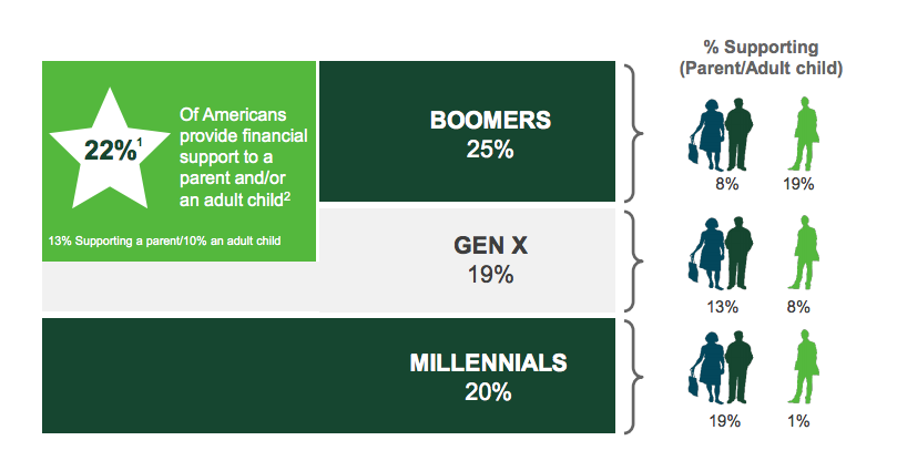 But TD Ameritrade's study, which aimed to find out how much financial support family members provide to their adult kin, revealed a surprising result. Overall, one-fifth of Americans are providing some type of substantial financial support to another family member. This primarily comes from parents providing for adult children, and adult children providing for elderly parents.