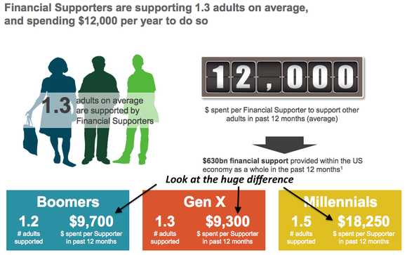 But while the overall percentage of Boomers who are "Financial Supporters" eclipses the percentage of millennials who find themselves in that role, the actual amount of assistance provided is skewed in a major way -- and in a direction you wouldn't expect.
