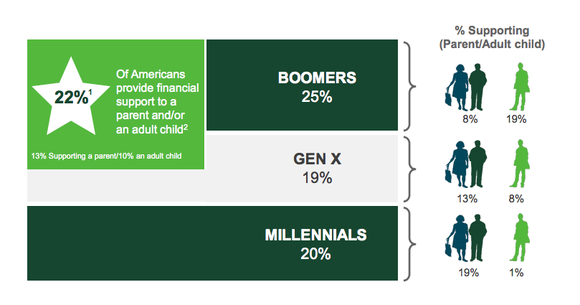 But TD Ameritrade's study, which aimed to find out how much financial support family members provide to their adult kin, revealed a surprising result. Overall, one-fifth of Americans are providing some type of substantial financial support to another family member. This primarily comes from parents providing for adult children, and adult children providing for elderly parents.
