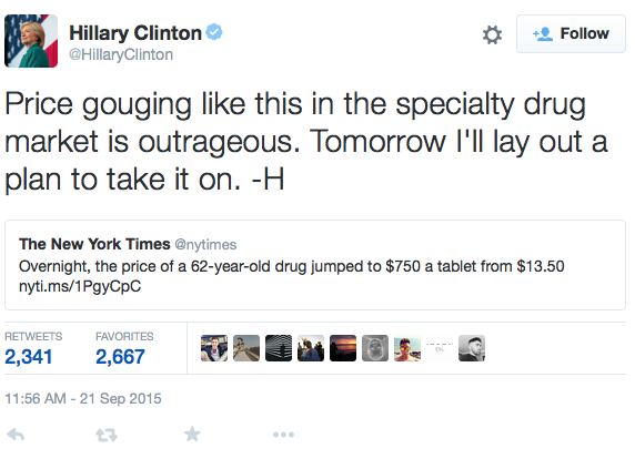 Now what: Earlier in the week, presidential-hopeful Hillary Clinton tweeted an article by The New York Times that referenced a huge price jump in a decades-old specialty drug, and she was not shy about expressing her outrage at the situation.