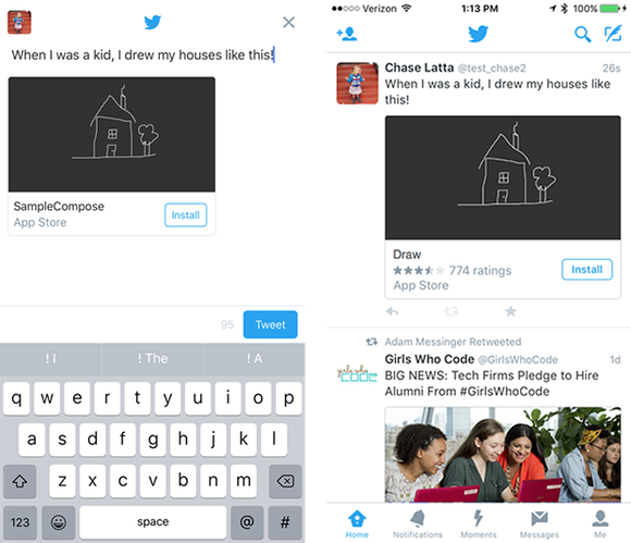 Second, Twitter updated its in-app tweet composer, allowing users to preview tweets before publishing them. Developers now have the option of adding an app-install card to those tweets, with a feature called Timeline Install Action. Twitter believes the ability to preview tweets before publishing them will increase total tweets sent from third-party apps, since users will know exactly what they're posting. That would naturally increase engagement for Twitter, and Twitter wants to give developers incentive to include the feature with the install button.