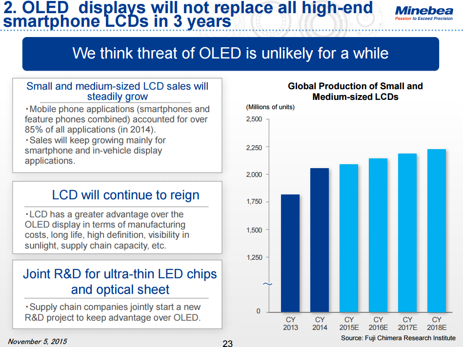 Additionally, Mineba says that various vendors within the LCD supply chain are working to build "ultra-thin LED chips and optical sheet[s]" in order to try to maintain technical advantages over OLED-based displays.