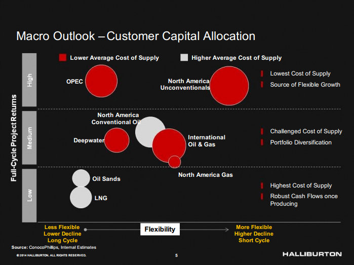 Because of this, shale is among the most flexible low-cost sources of oil. We saw this flexibility on full display this year with shale producers adjusting their capital budgets with quite regularity, in some cases adjusting it higher when the oil price rallied earlier in the year, only to reduce the budget when that rally faded. Because of this flexibility, Halliburton's view is that once producers have some excess cash flow from higher oil prices, the first place that cash will be invested will be in additional shale wells, which will boost activity.