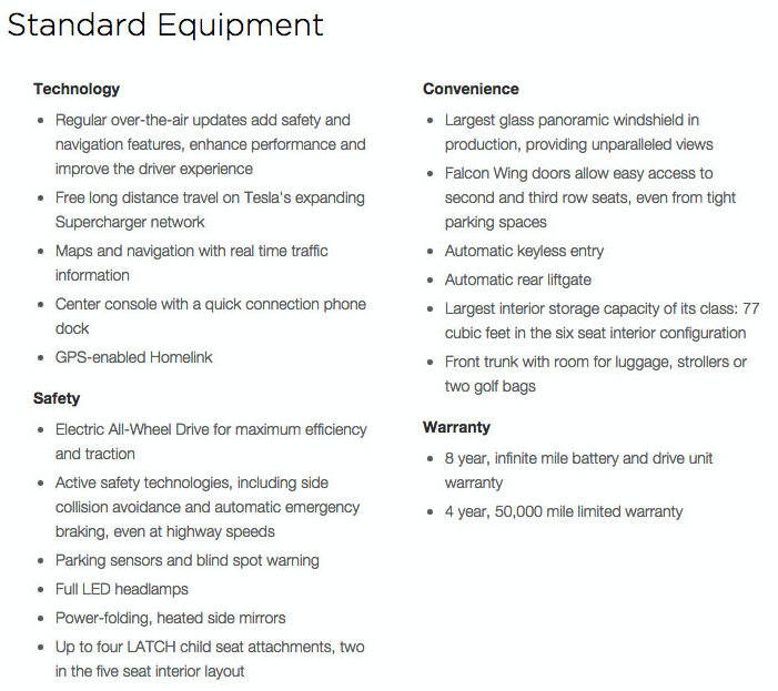 Standard features detailed in Model X configurator. The configurator for Model X is still available by invite only, though it has been extended to a larger base of reservation holders. Image source: Tesla Motors.