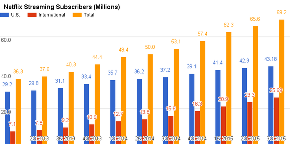 Netflix ended the third quarter of 2015 with a total of 69 million members around the world, 42 million of them in the U.S., and the remaining 26 million in international markets. Growth will probably slow down in the U.S., but international markets should remain powerful growth drivers in the middle term.