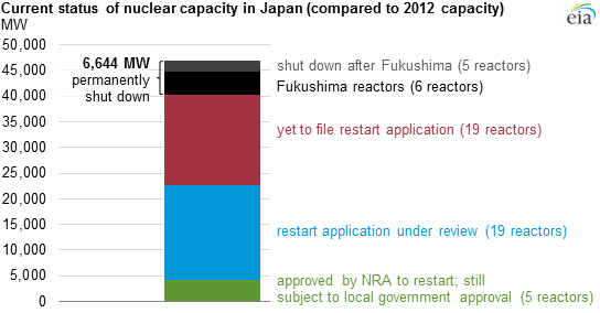 According to the U.S. Energy Information Administration, the handful of reactors that have been approved to come back on line provide only about five gigawatts of power. That's compared to the 45 gigawatts or so that Japan's nuclear fleet provided before the shutdown. Around 6.5 gigawatts is gone for good from the old fleet.