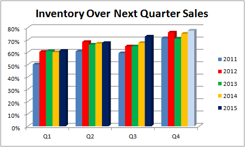 That said, risk is rising with the stock. The chart below shows Deere's current inventory divided by the next quarter's sales.The ratio has gone higher throughout 2015 when compared with previous years -- an indication that Deere is having difficulty clearing inventory.