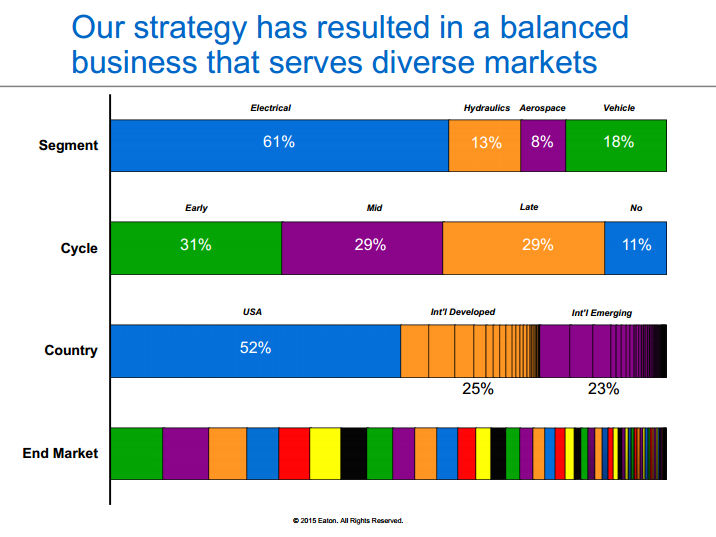 Bu the company's diversification doesn't stop there. Although the U.S. is half the business, developed and emerging markets are each big contributors. And it's revenue is spread fairly evenly over the market cycle, too. So, one investment buys you a lot of diversification. Which helps explain why Eaton is still profitable despite the business headwinds it's facing.