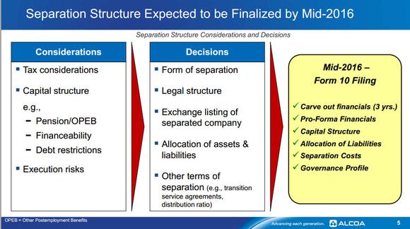 There are a lot of moving parts here. And there are a lot of connections between the two companies that have to be sorted out. For example, with upstream and value-add under one umbrella, Alcoa is a vertically integrated company. Basically, upstream makes the materials (aluminum) that value-add uses to make things like high-tech jet engine parts.