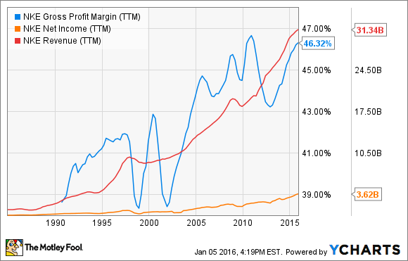 Nike consistently delivered one solid quarter after another, with an outsized focus on improving margins, fostering innovation in its products, and returning billions in capital to shareholders through dividends and stock repurchases. When all was said and done, Nike stock managed to climb an impressive 30% in 2015, handily outpacing the broader market's returns: