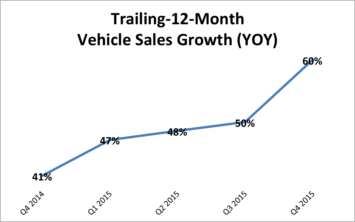 Year-over-year growth in vehicle units shipped for trailing-12-month periods. Data for chart retrieved from company SEC filings and press releases for quarters shown. Chart source: Author.